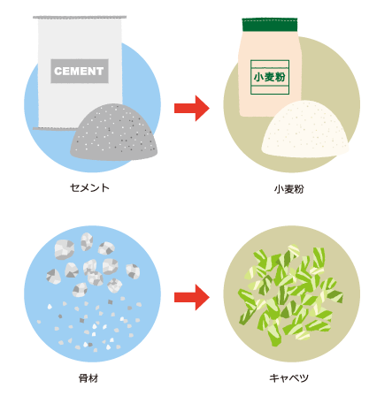 まず、セメントとコンクリートを同じ意味で使われているのをよく耳にしますが、セメントは粉で、お好み焼きでいえば小麦粉にあたり、水と混ぜると固まり始めます。材料の小麦粉がセメントで、お好み焼きがコンクリートと考えてください。