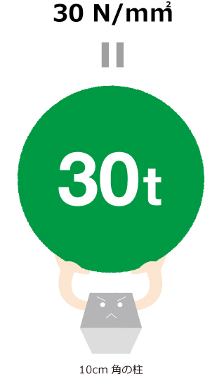 コンクリートの強度はN/m㎡(ニュートン・パー・平方ミリメートル)で表します。例えば30N/m㎡は1平方ミリメートル当たり約3kgの重さに耐えられることを意味します。もう少し分かりやすく言い換えると、10cm角の柱で30トンの重さを支えられるということです。