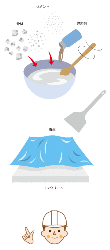 お好み焼きにはキャベツなどの具材が入っていますよね。コンクリートにも骨材(こつざい)と呼ばれる砂や石が入っており、これがキャベツにあたります。また、お好み焼きをおいしくするために出汁や山芋などを入れますが、コンクリートにも性能を高めるために混和剤(こんわざい)と呼ばれる材料を入れます。